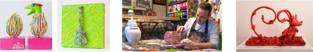 De eerste galerij ‘Smets Art’ raakte me het meest. Robby vertelde hoe hij zijn droom, een eigen ‘pop up’ galerij, eindelijk vorm had gegeven en er gewoon voor ging. Keihard werken zei hij, maar wel heel leuk om oude objecten en gevonden items een nieuw kleurrijk leven te geven en die kleur echt in je leven te integreren én in dat van zijn klanten.