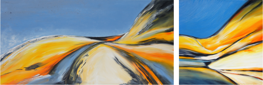 Het deed me denken aan de energie waarmee deze doeken ‘Rolling Rocks’ en ‘Two birthdays’ enkele jaren geleden in Ennis ontstonden.
