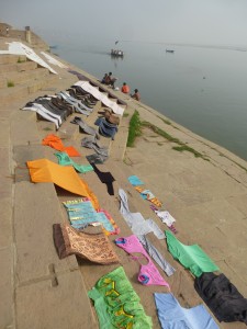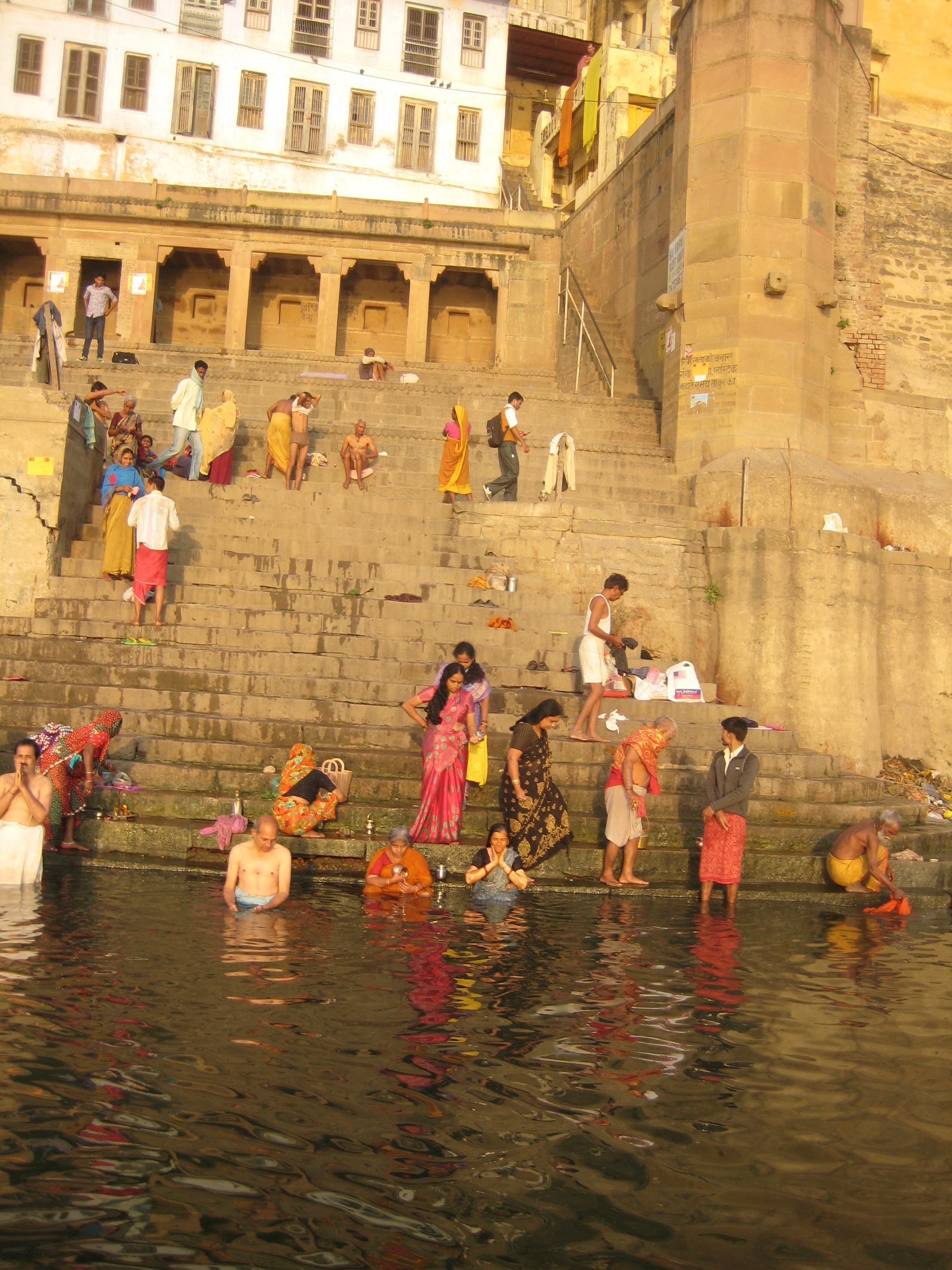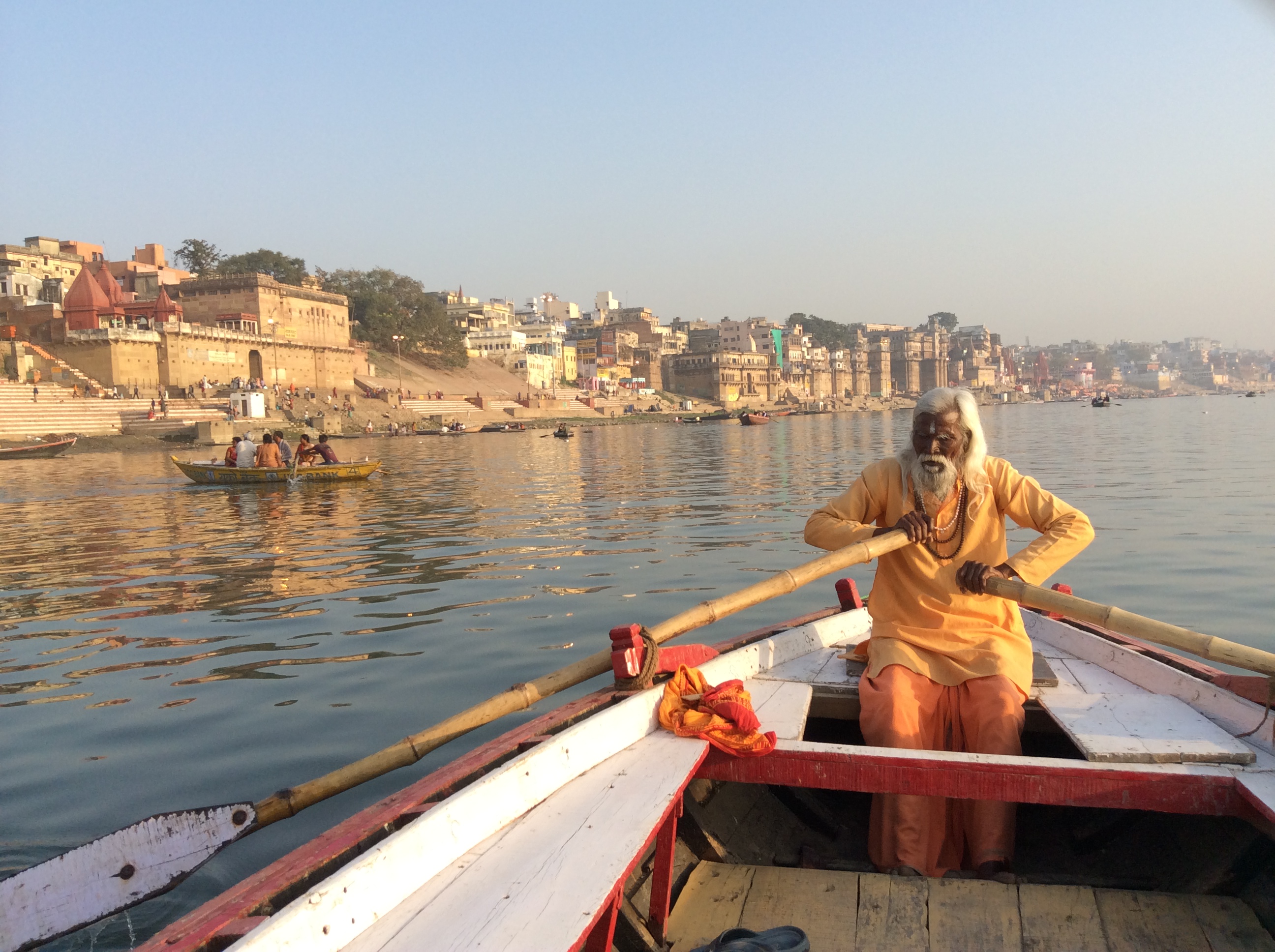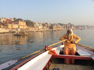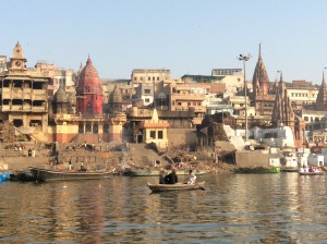 Ik trok ook naar Varanasi, een heilige stad voor de hindoes, en ontmoette er verschillende spirituele leraren. Het is een zinderende stad waar de Ganges doorheen loopt. Miljoenen mensen bidden er dagelijks. Ze staan tot aan hun middel in het water en bidden met hun handen in namaste-houding, hun gelaat naar de zon gekeerd. Ze drinken uit de Ganges, ze wassen zichzelf, hun kleren en hun buffels in het vervuilde water. Ik heb geen idee hoeveel mensen er ieder jaar sterven aan dysenterie. Maar het is en blijft voor mij verrukkelijk om op de trappen langs de Ganges, de ghats, te wandelen en van de ene verbazing in de andere te vallen. Alle gangbare concepten lijken hier op te lossen, alles is zo vreemd en tegelijk zo bekend. De devotie die ik hier zie, het bidden, het baden, de bloemetjes, de lichtjes, mediterende mensen, gezangen, klokkengeluiden, priesters in witte gewaden onder hun parasols in gesprek met mensen die hulp komen vragen, de rituelen en het altijd stromende majestueuze zijdeachtige water van de heilige Ganges. Het doet wat met een mens.