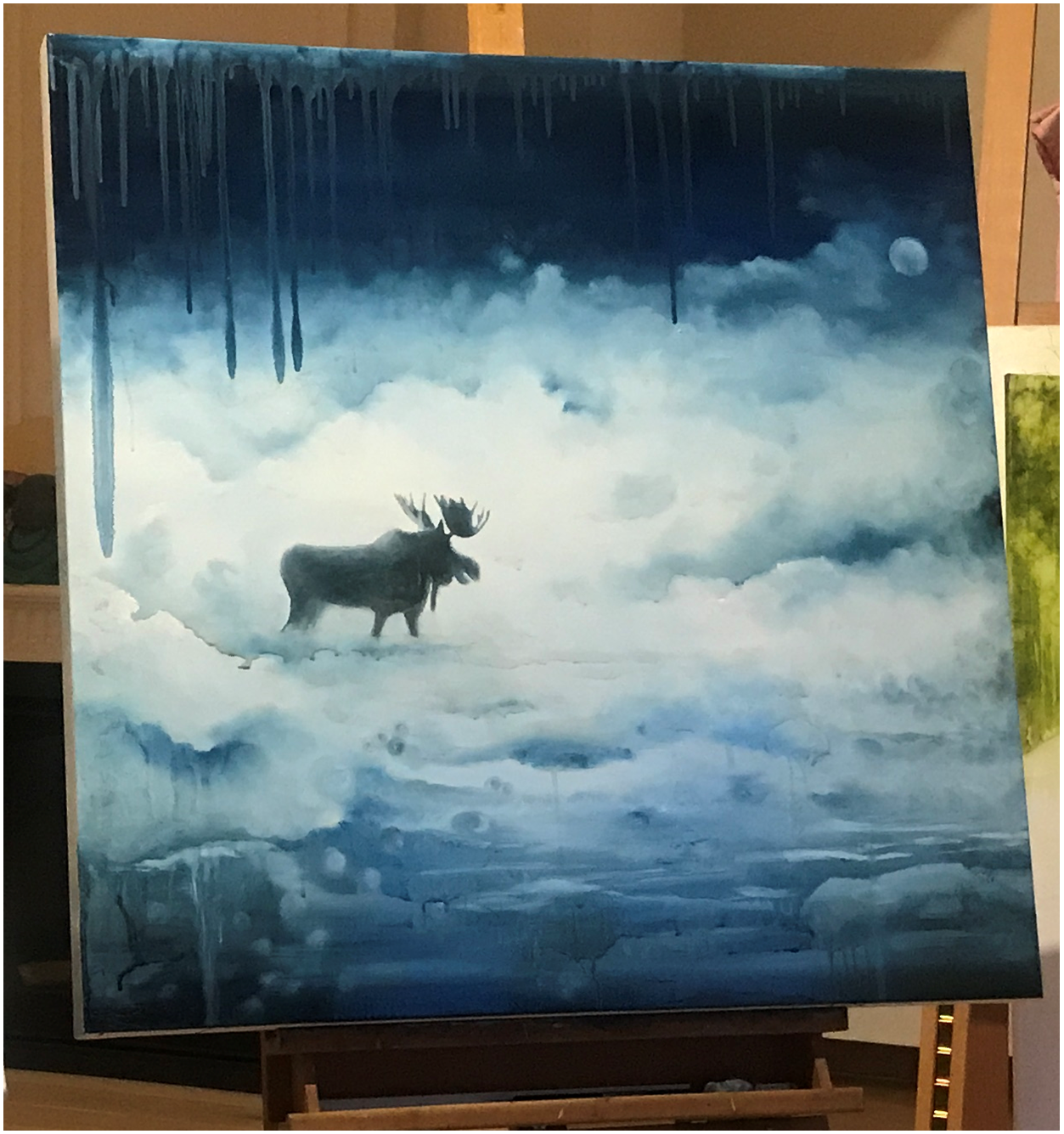 Maar ik liep vast. Weken bleef mijn doek ‘Blue moose’ in z’n basis staan. Toen ik een ander doek wou afwerken en ook dat niet lukte, de kleuren zaten volledig fout, de sfeer was niet wat ik wou…, voelde ik me ellendig, ‘grrrr, waarom lukt het niet’? Echt down, boos en gefrustreerd zei ik: ‘Zie, ik kan het niet, ik doe het niet goed, mijn ‘Blue moose’ (blauwe eland) wil ook niet lukken’!