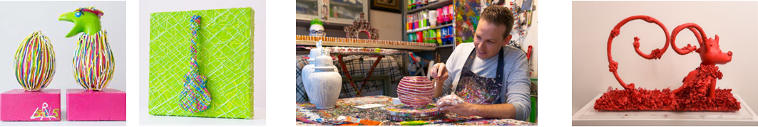 De eerste galerij ‘Smets Art’ raakte me het meest. Robby vertelde hoe hij zijn droom, een eigen ‘pop up’ galerij, eindelijk vorm had gegeven en er gewoon voor ging. Keihard werken zei hij, maar wel heel leuk om oude objecten en gevonden items een nieuw kleurrijk leven te geven en die kleur echt in je leven te integreren én in dat van zijn klanten.