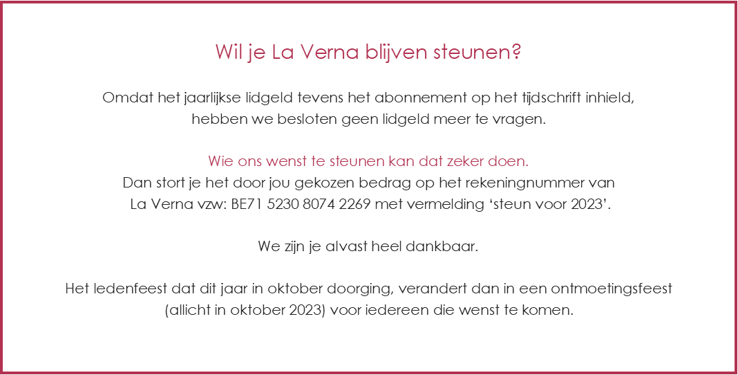 La Verna zal verder leven. Kathleen en Julia zijn volop bezig met de overstap naar een meer digitale communicatie. We blijven actief. Wie de nieuwsbrief nog niet ontvangt kan zich aanmelden via de website (www.laverna.be). Zo blijven jullie op de hoogte van het reilen en zeilen van La Verna en ik zal er eveneens mijn spontane schrijfsels in delen. We gaan ook Facebook meer leven inblazen, en er is ook een account op Instagram (@la_verna_vzw).