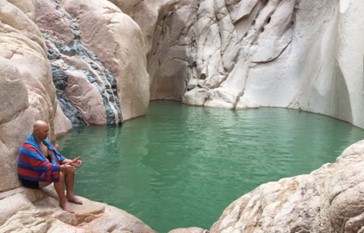 Diep in de Sinaï woestijn tussen rotsen is er een bekken vol zuiver en helend water. Dit bassin symboliseert de baarmoeder waar ik deelnemers met alle zachtheid begeleid tot in de baarmoeder. Hier krijgt elke deelnemer een zuivering en een inwijding tot wedergeboorte.